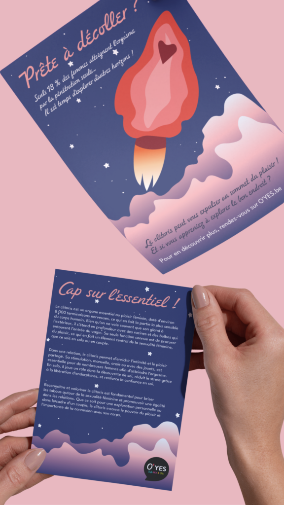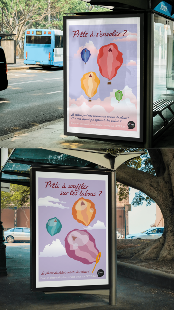 J’ai conçu une campagne de sensibilisation pour l’organisation O’YES, autour de la sexualité féminine. L’objectif était de briser les tabous liés au plaisir féminin, d’informer sur l’anatomie du clitoris et de promouvoir une sexualité plus libre et épanouie. Mes illustrations représentent des clitoris dans les airs, pour rappeler qu’une si petite chose peut suffire à nous emmener au septième ciel.