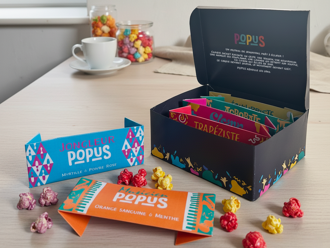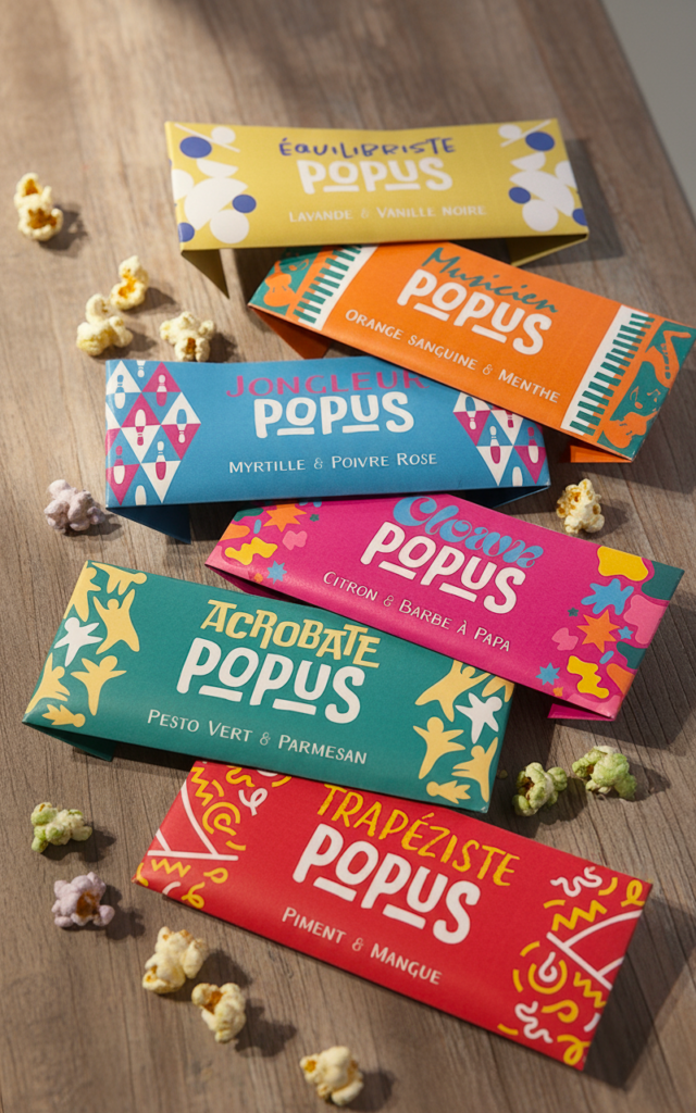 Pour ce projet, j’ai imaginé Popus, une gamme de popcorn inspirée des métiers du cirque. Chaque discipline circassienne est traduite à travers un sachet de popcorn et sa saveur inattendue, créant un lien ludique entre univers graphique, goût et narration. L’objectif était de concevoir un ensemble cohérent, tout en donnant à chacun une identité visuelle forte, propre à son métier du cirque. Les choix de couleurs, de motifs et de typographies permettent de différencier les disciplines tout en maintenant une unité graphique globale, pensée comme un véritable coffret de découverte.