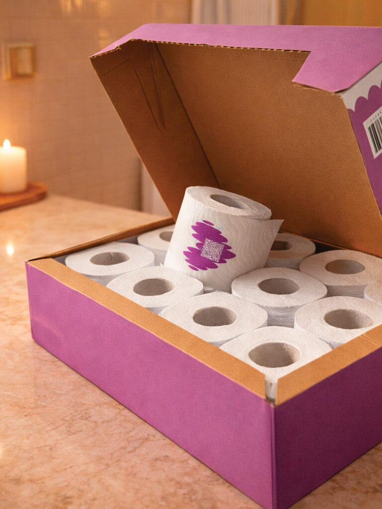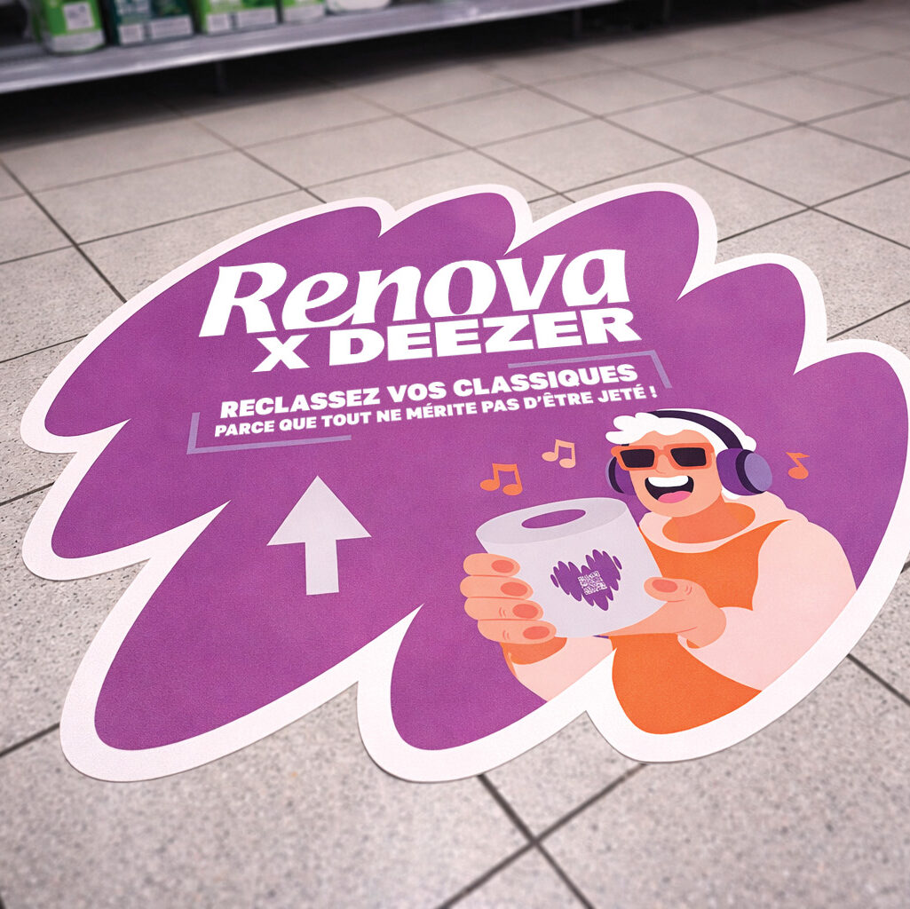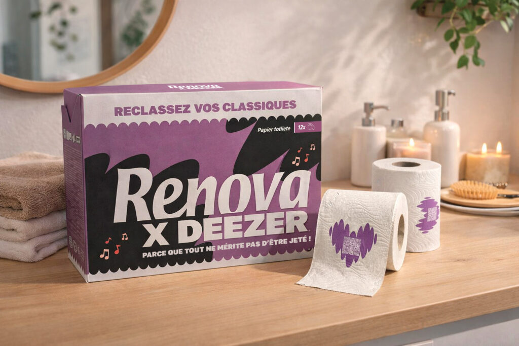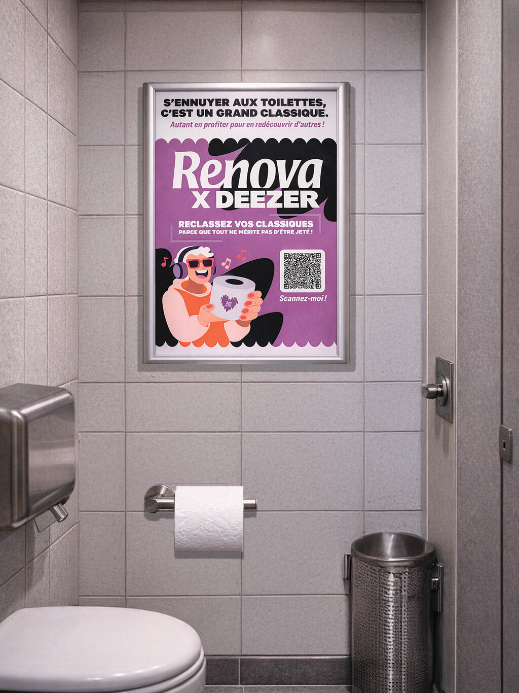 Ce projet imagine une collaboration fictive entre Renova et Deezer autour d’un papier toilette en édition limitée. Le concept détourne avec humour le jugement rapide porté sur certaines musiques considérées comme dépassées. Chaque feuille intègre un QR code menant à un morceau à redécouvrir, invitant l’utilisateur à lui offrir une seconde chance. Le design fusionne les univers graphiques des deux marques pour proposer une expérience ludique et interactive.